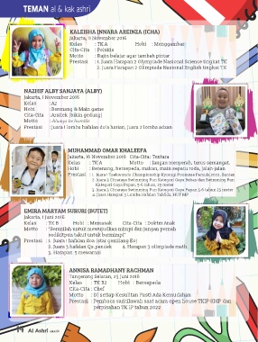 Prestasi    : Juara 1 lomba hafalan do'a harian, Juara 2 lomba adzan